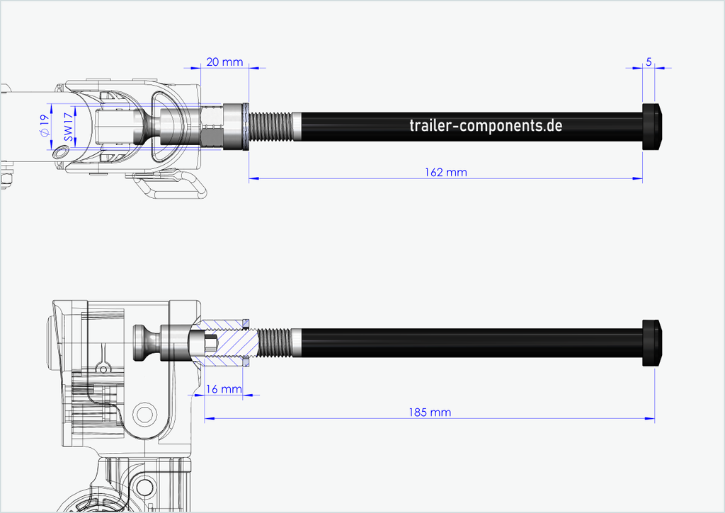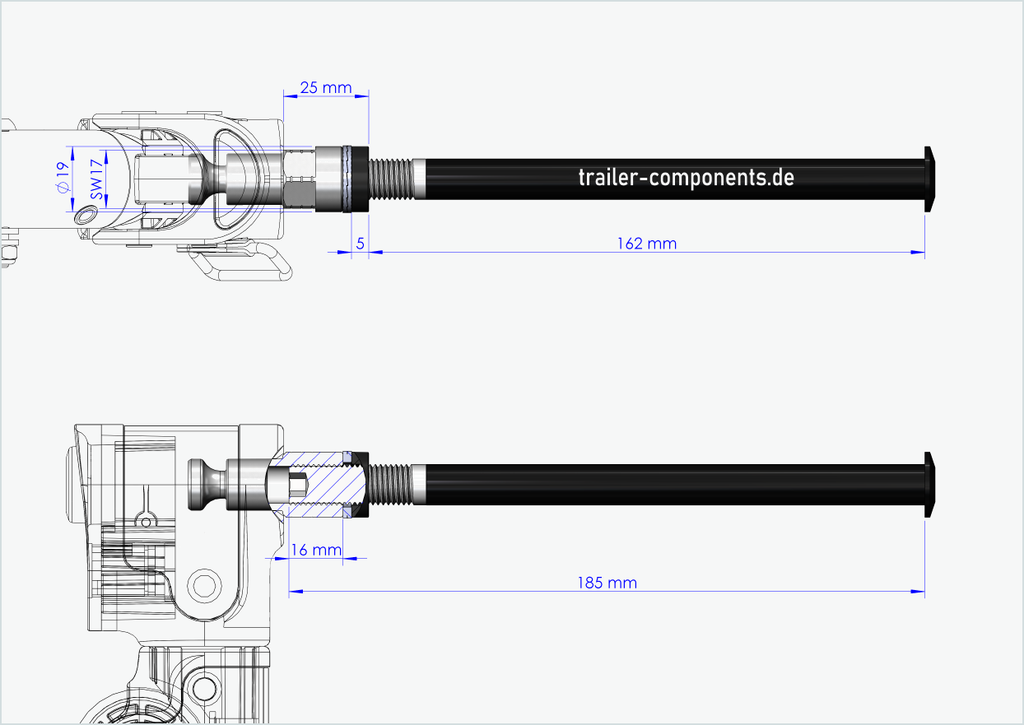 - Es su responsabilidad determinar el tamaño de rosca correcto y la longitud de instalación [mm] de su eje pasante actual en la rueda. No intente montar nuestro eje pasante con adaptador en un tamaño de rosca diferente en el buje de su rueda trasera. Un tamaño de rosca incorrecto puede dañar su bicicleta. Si no está seguro del tamaño de rosca y la longitud de instalación correctos, póngase en contacto con nosotros por correo electrónico o por teléfono y estaremos encantados de ayudarle.